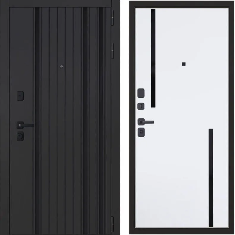 Порошковое покрытие "муар черный". Панель МДФ 10 мм (цвет "черная шагрень"). Объемная фрезеровка. Вертикальные вставки из пластика 3 шт (цвет "черный"). Наличник МДФ 80 мм.