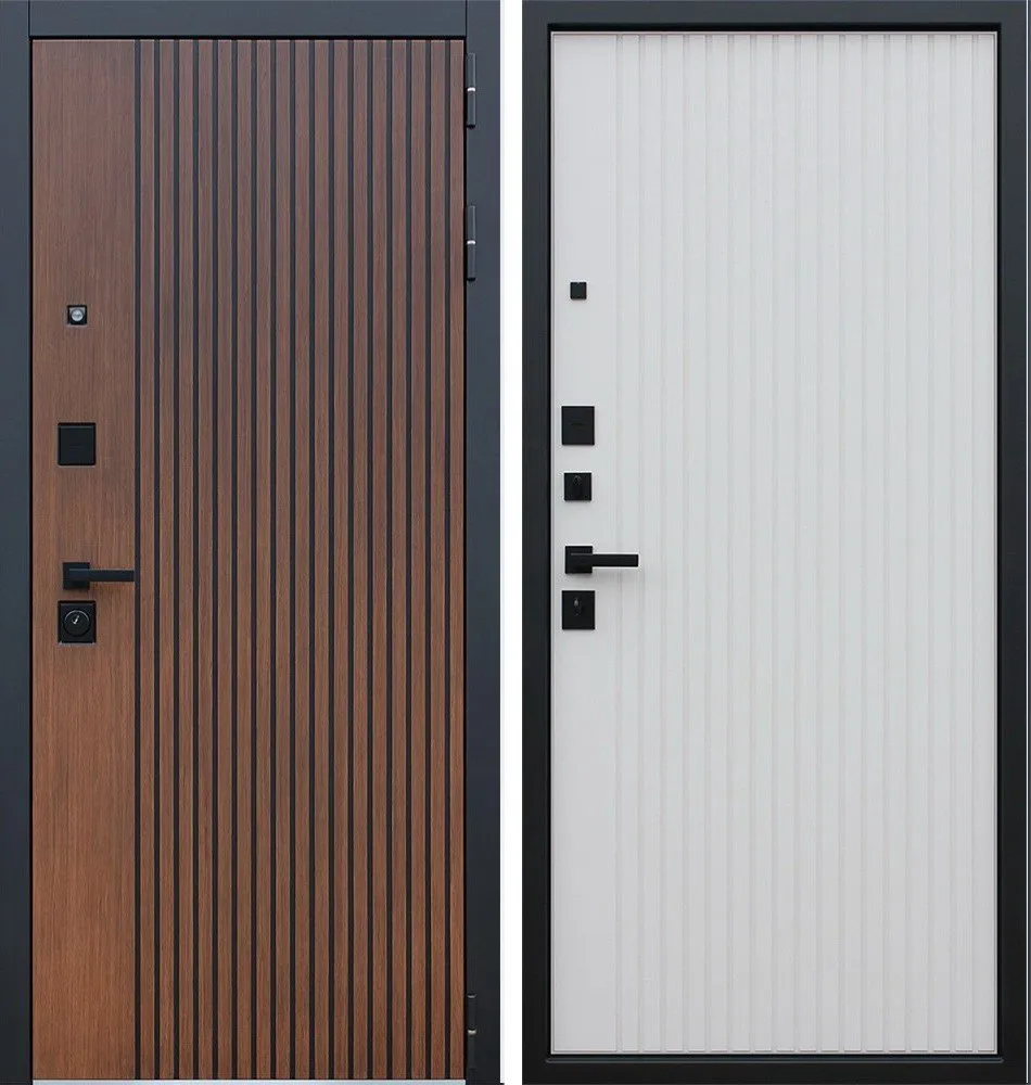 Порошковое покрытие "Муар черный". Экошпонированная дизайнерская панель МДФ 10 мм. Линейная фрезеровка. Цветовая комбинация: "дуб кантри темный", черное патинирование по фрезеровке. Наличник МДФ гладкий 80 мм., цвет "черный кварц".