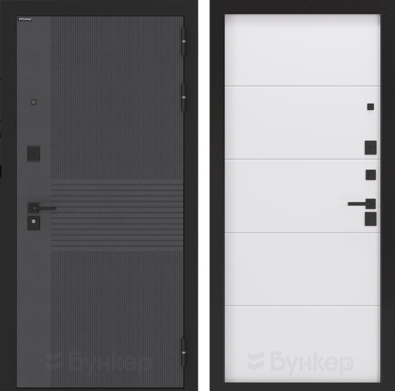 Черная матовая: Броненакладкая, сувальдные накладки со шторкой, ручка, ночник, цилиндр ключ-вертушка, глазок по центру или сбоку