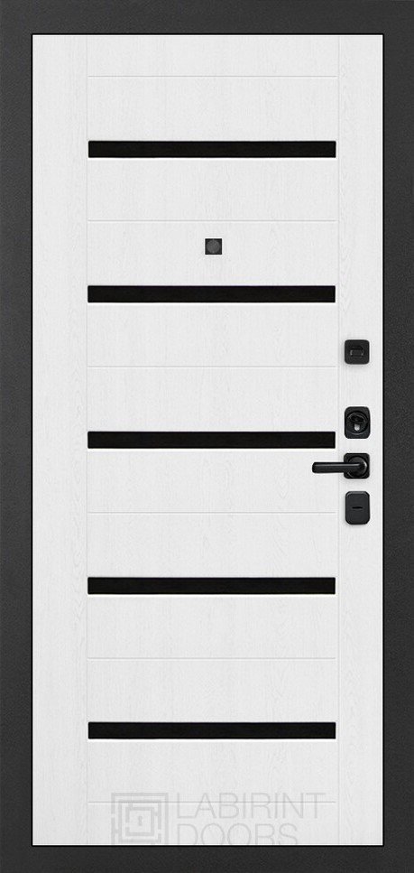 Фурнитура в черном цвете: Броненакладка врезная, накладка со шторкой, глазок , дверная ручка, ночная задвижка. Цилиндр ключ-вертушка Apecs, регулируемый эксцентрик.